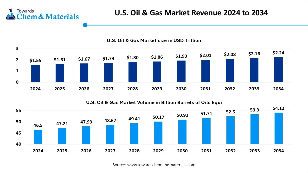 According to Towards Chemical and Materials, the U.S. oil & gas market size is calculated at USD 1.61 trillion in 2025 and is expected to be worth around USD 2.24 trillion by 2034, growing at a compound annual growth rate (CAGR) of 3.75% over the forecast period 2025 to 2034.